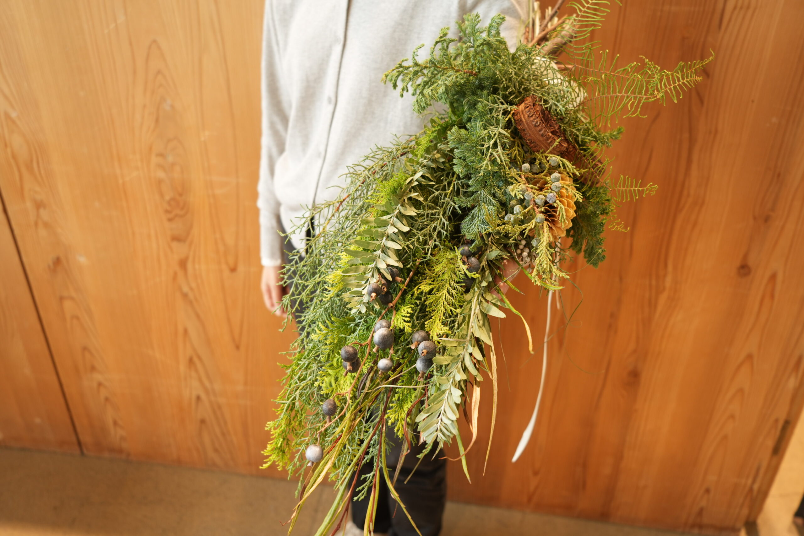 今回は冬をテーマに「Xmasやお正月」にも飾って楽しめる、リースとスワッグになります。