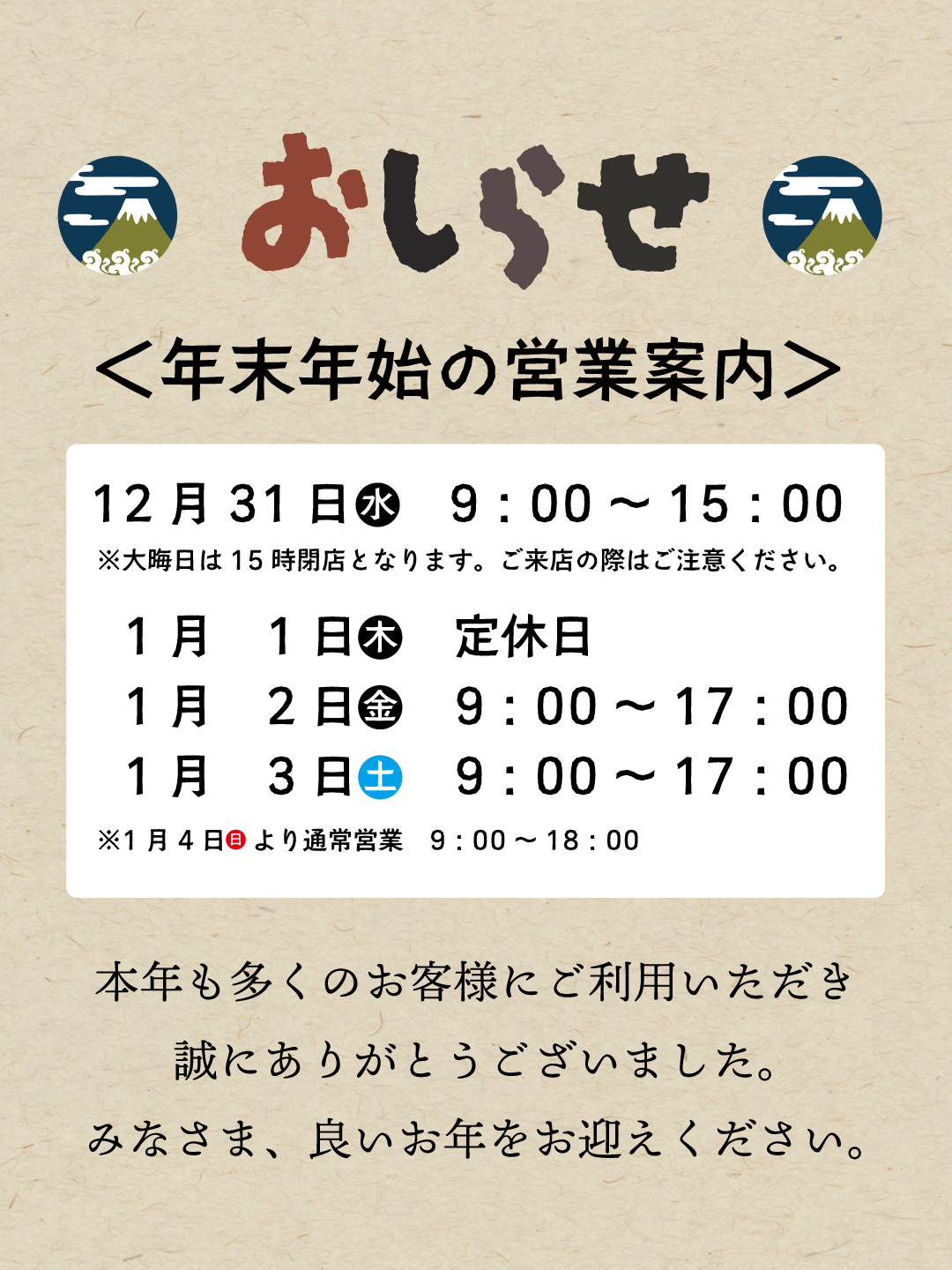 ※今年より大晦日は “15時閉店” となります。ご来店の際はご注意ください。